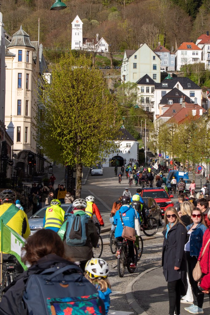 På 25. april var den første Critical Mass i Bergen i 2025, og vi var over 100 deltakere + til og med en hund! Noen av oss ble med underveis, men de fleste av oss var med fra start. Vi samlet oss ved Den blå stein kl 18:00 og syklet sammen i omtrent 45 min til rutens endepunkt ved Bici Kunst i Sandviken. Folk i ulike aldre, kjønn og sosiale grupper ble med. Mange brukte sine egne sykler, mens andre benyttet bysykler.
