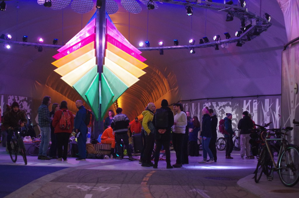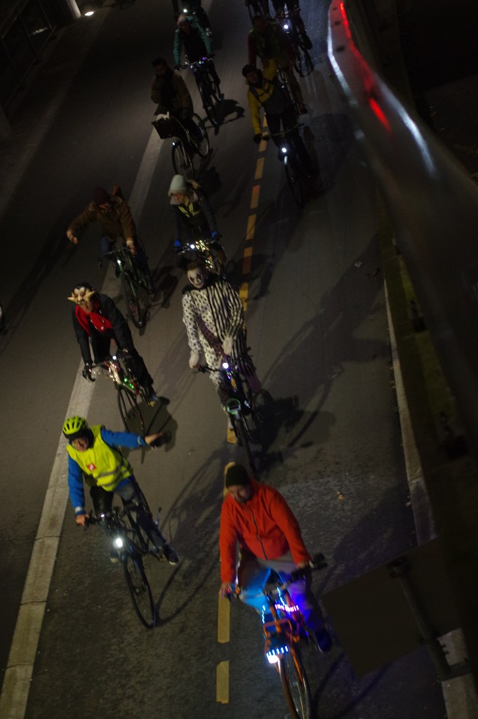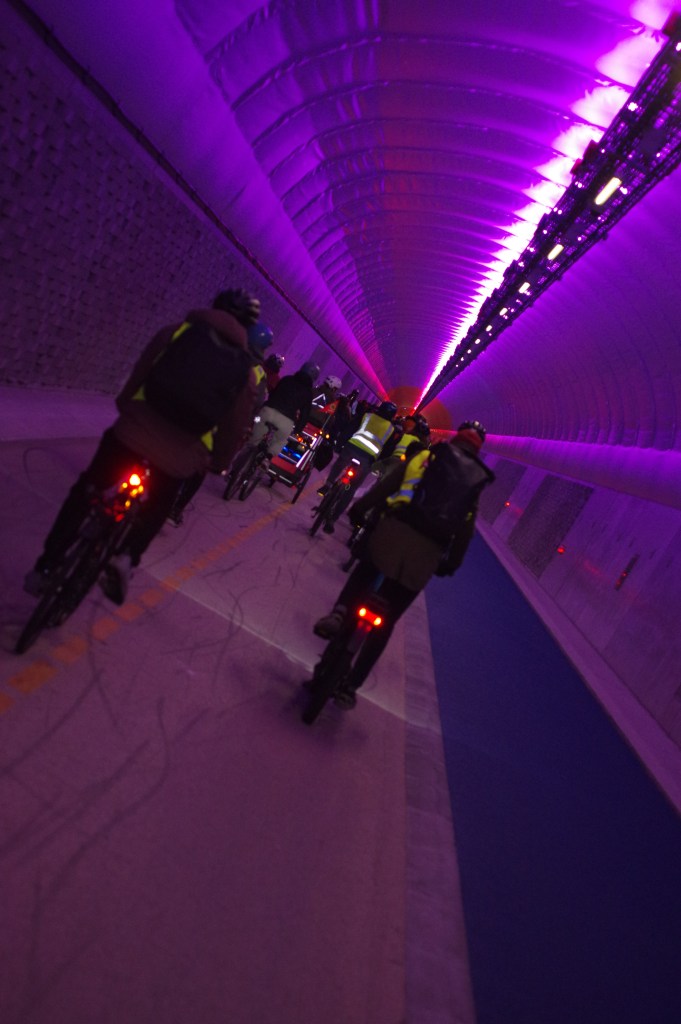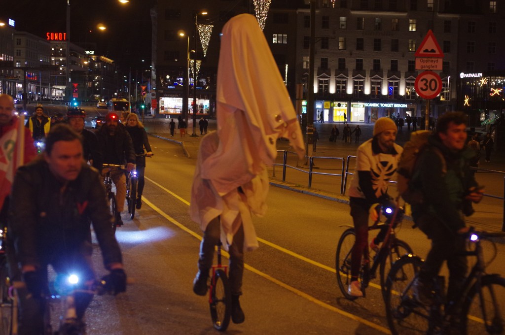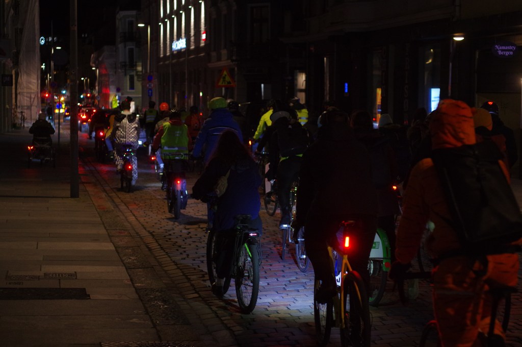 Til vår siste Critical Mass i år hadde mange kledd seg ut i kostymer og pyntet syklene sine med lyslenker. Etter en runde gjennom sentrum satte vi kursen mot et helt spesielt mål: Fyllingsdalstunnelen! På vei dit syklet vi for første gang ut på E39. Det som ingen ville ha turt å gjøre alene, ble plutselig mulig. Alle tre kjørefeltene ble tatt i bruk i 550 meter fram til neste kryss. Et øyeblikk kunne vi drømme om hvordan det ville vært hvis syklister fikk så god plass og en så direkte rute fra A til B. Deretter fulgte vi den godt utbygde sykkelveien langs Kanalveien fram til verdens lengste sykkeltunnel. Midt i tunnelen avsluttet vi turen sammen. Det ble en morsom og minneverdig avslutning på årets siste Critical Mass.